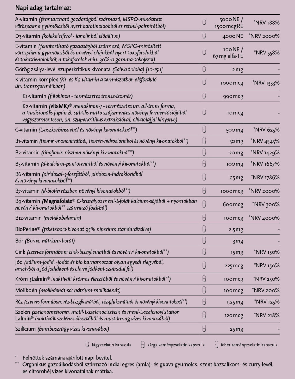 Minden vitamint, ásványianyagot, nyomelemet ideális formában, mennyiségben és arányban tartalmaz.