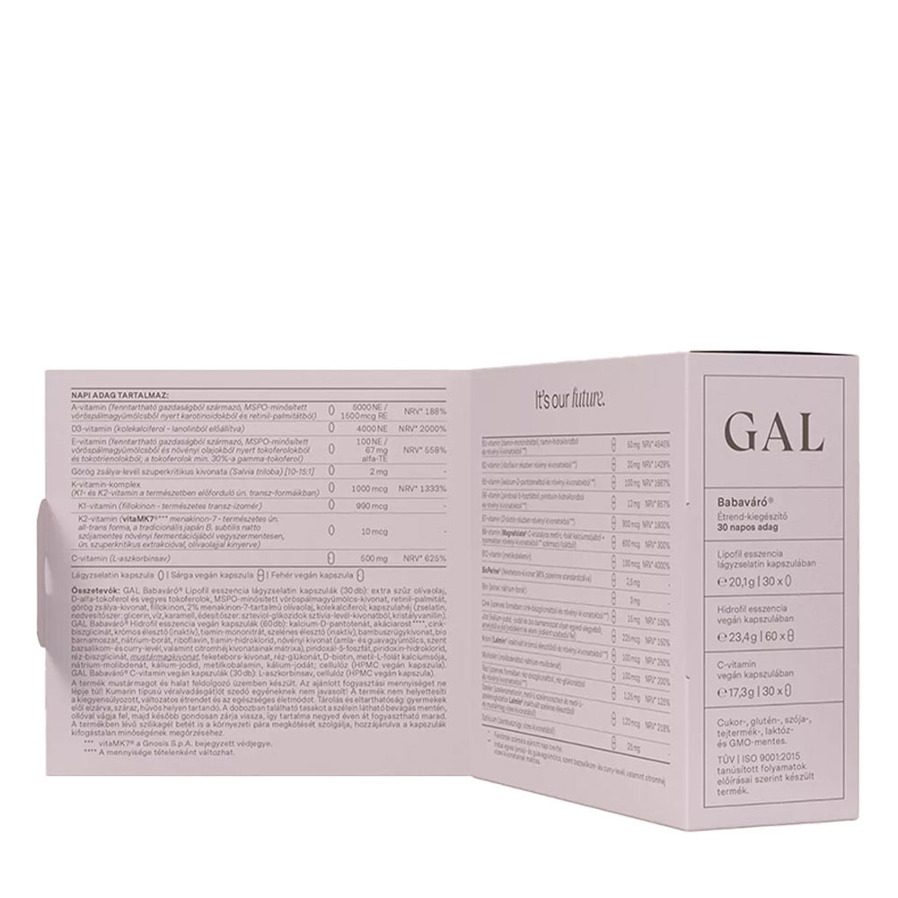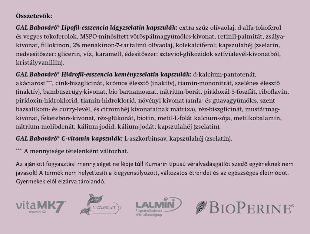 GAL Babaváró termékünket a legújabb kutatások fényében fejlesztettük ki, szem előtt tartva a természetességet és életszerűséget. Azaz minden vitamint, ásványianyagot, nyomelemet ideális formában, mennyiségben és arányban tartalmaz, nem eltérve attól, ahogyan ezekhez állandó tápanyagdús, változatos táplálkozással juthatnánk. Ezen hatóanyagok mindegyike természetben megtalálható forma, jelentős részük organikus termesztésből származó (bio) gyógy- és fűszernövényekből van kivonva, így azon ko-faktorokból is tartalmaz, amelyek e növényekben aligha véletlenül vannak jelen a bennük lévő vitaminok/ásványok mellett. A mennyiségek esetében végig fontosnak tartottuk, hogy a napi adag biztosan tartalmazza a hatásosnak talált dózist, de semmi esetre se lépd túl az életszerű mennyiségeket, azaz azt a mennyiséget, amit táplálkozással már nem is lehetne fedezni sehogyan sem.