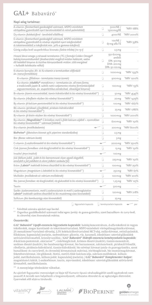 A GAL+ Babaváró® termékünket a legújabb kutatások fényében fejlesztettük ki, szem előtt tartva a természetességet és életszerűséget, hogy minden vitamint, ásványianyagot, nyomelemet ideális formában, mennyiségben és arányban tartalmazzon, nem eltérve attól, ahogyan ezekhez állandó tápanyagdús, változatos táplálkozással juthatnánk. Ahol előnyös, a vitaminok és ásványok részben organikus termesztésből származó (bio) gyógy- és fűszernövények kivonatából származnak. A mennyiségek esetében végig fontosnak tartottuk, hogy a napi adag biztosan tartalmazza a hatásosnak talált dózist, de semmi esetre se lépje túl az életszerű mennyiségeket, azaz azt a mennyiséget, amit táplálkozással már nem is lehetne fedezni sehogyan sem. Emellett rendkívül fontos, hogy egy új élet zavartalan fejlődését ne akadályozza semmi, ami nem odavaló. A termékünkben ilyesminek nyomát sem találja.