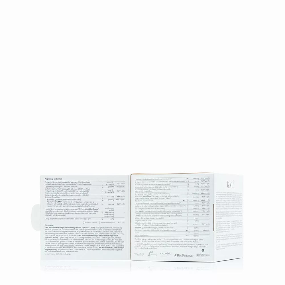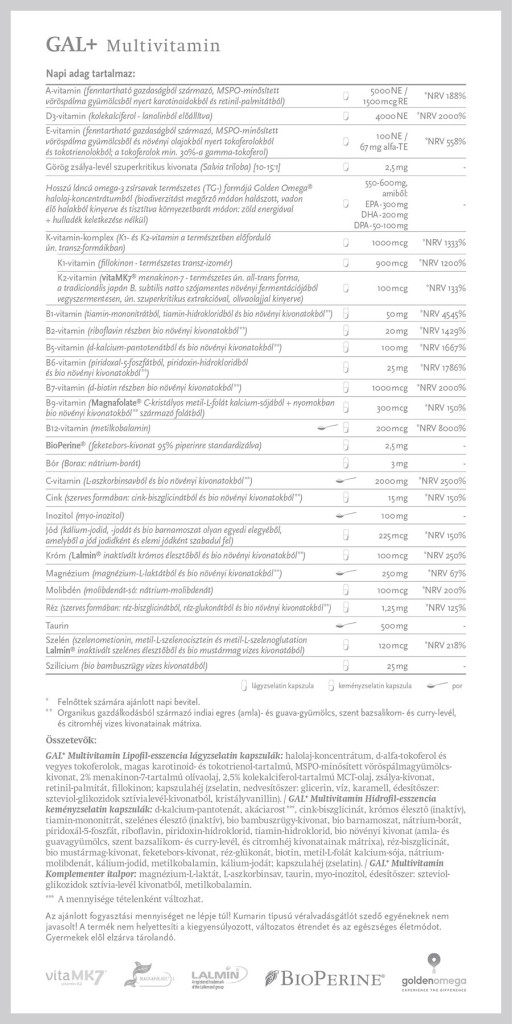 A GAL+ Multivitamin termékünket a legújabb kutatások fényében fejlesztettük ki, szem előtt tartva a természetességet és életszerűséget, hogy minden vitamint, ásványianyagot, nyomelemet ideális formában, mennyiségben és arányban tartalmazzon, nem eltérve attól, ahogyan ezekhez állandó tápanyagdús, változatos táplálkozással juthatnánk. Ahol előnyös, a vitaminok és ásványok részben organikus termesztésből származó (bio) gyógy- és fűszernövények kivonatából származnak. A mennyiségek esetében végig fontosnak tartottuk, hogy a napi adag biztosan tartalmazza a hatásosnak talált dózist, de semmi esetre se lépje túl az életszerű mennyiségeket, azaz azt a mennyiséget, amit táplálkozással már nem is lehetne fedezni sehogyan sem. Emellett rendkívül fontos, hogy a gondosan válogatott alapanyagok mellett ne lábatlankodjék semmi, ami nem odavaló. A termékünkben ilyesminek nyomát sem találja.