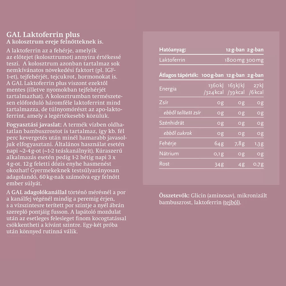 A laktoferrin az a fehérje, amelyik az előtejet (kolosztrumot) annyira értékessé teszi. A kolosztrum azonban tartalmaz sok nemkívánatos növekedési faktort (pl. IGF-1-et), tejfehérjét, tejcukrot, hormonokat is. A GAL Laktoferrin plus viszont ezektől mentes (illetve nyomokban tejfehérjét tartalmazhat). A kolosztrumban természetesen előforduló háromféle laktoferrint mind tartalmazza, de túlnyomórészt az apo-laktoferrint, amely a legértékesebb közülük. Ezt a terméket a Táplálkozás-Beállítás™ szakmai csapatával közösen fejlesztettük.