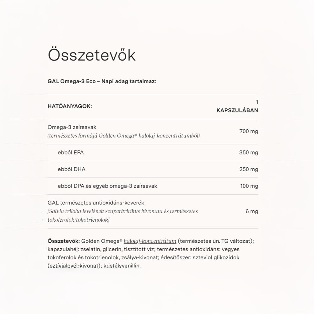 Termékünkben a Golden Omega® halolaj-koncentrátum természetes változatát alkalmazzuk, mert nulla ökológiai lábnyommal állítják elő vadon élő apróhalakból, a halászatnál figyelnek a biodiverzitás megőrzésére, és a modern előállítási technológia során nem keletkezik semmi felesleges hulladék vagy szennyezőanyag → IFFO RS és Friends of the Sea tanúsítvány.