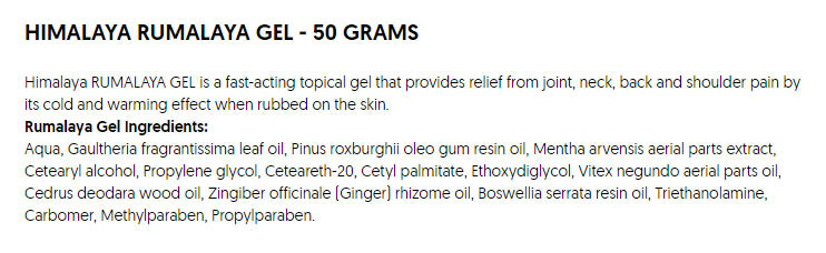 A Himalaya Rumalaya Gel egy hatásos és biztonságos krém, amely enyhíti a különféle ortopédiai betegségekkel járó ízületi és csontfájdalmakat. A formula Gandhapura tailát és Shallaki-t tartalmaz. Az Indian Winter Green (Gandhapura taila) olaj 98% metil-szalicilátot tartalmaz, amely egy jól ismert fájdalomcsillapító. Helyileg alkalmazva enyhíti a reuma és az isiász okozta fájdalmakat. A Boswellia (Shallaki) kivonat hatékonyan csökkenti az ízületek duzzanatát, fájdalmát, merevségét és a gyulladásos ízületi rendellenességek egyéb tüneteit, beleértve a reumatoid artritist és az osteoarthritist. A gyógynövény emellett javítja az ízületek vérellátását és helyreállítja a görcsök által sérült erek integritását.