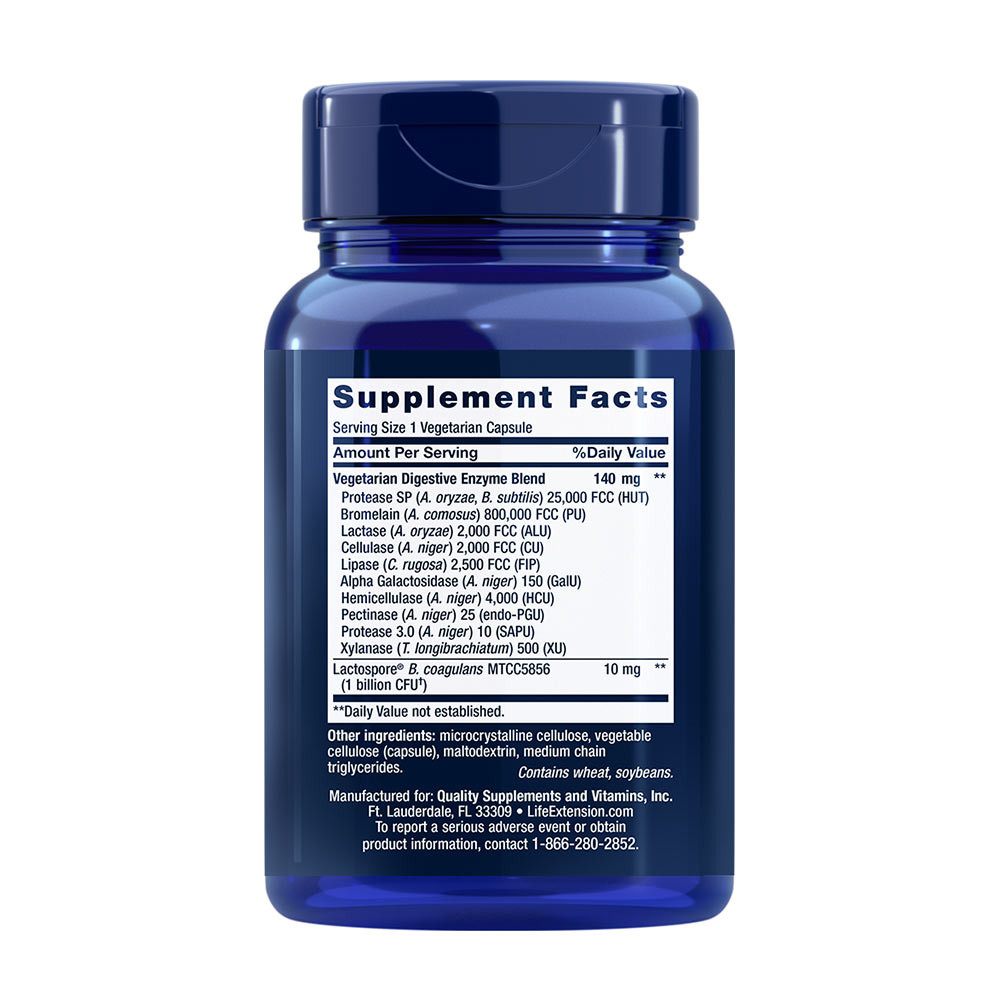 A Life Extension Digestive Enzymes and Probiotics 10 vegetáriánus-barát enzimet biztosít, valamint a probiotikus B. coagulans-t, amely támogatja a GI-egyensúlyt és megemészti a makro-, például fehérje-, tejtermék- és zsírtartalmú anyagokat.