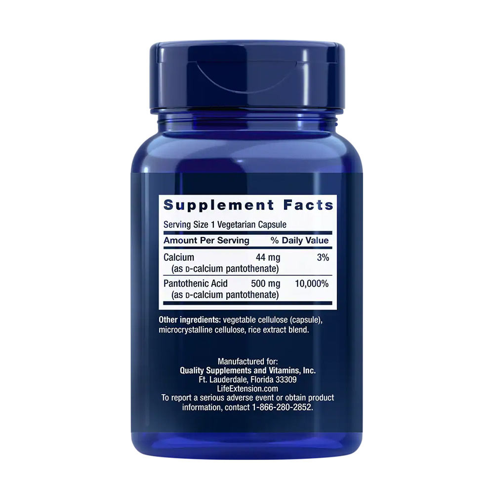 A Life Extension Pantothenic Acid B5-vitamint biztosít, amely az A koenzim fontos összetevője, mivel számos anyagcsere-útvonalat segít elő, és szükséges a zsírok sejtekbe és sejtekből történő átviteléhez.