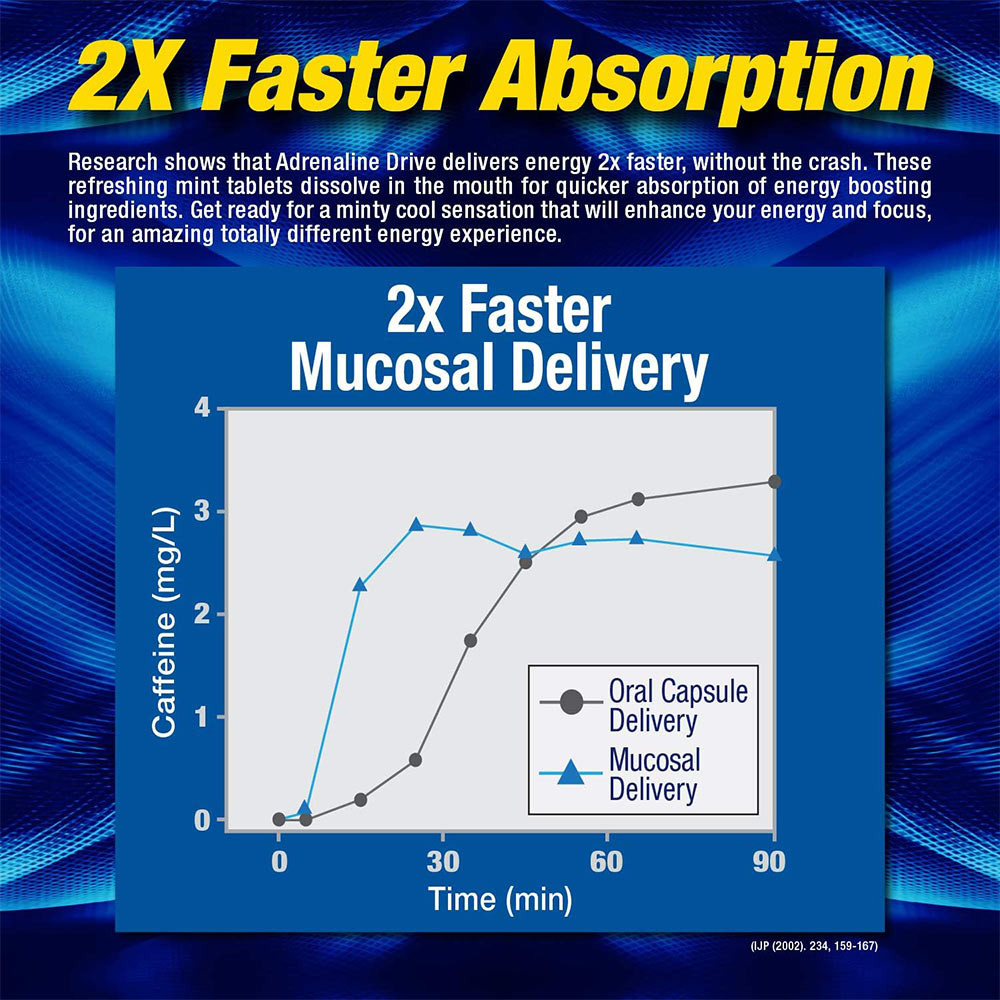 Az Adrenaline Drive egy újszerű „energiamenta”, amelyet az innovatív sportkiegészítő cég, az MHP (Maximum Human Performance) tervezett. Minden Fastsorb oldódó tabletta kulcsfontosságú összetevőket tartalmaz, amelyek erőteljesen fokozzák az összpontosítást és a koncentrációt. Ha hagyod, hogy az energiamenta tabletták elolvadjanak a szádban, kihasználhatod a nyelv és a száj nyálkahártyáján keresztüli kiváló felszívódási utakat, így a hatás szinte azonnali, és felülmúlja a hagyományos energiahordozó rendszereket.