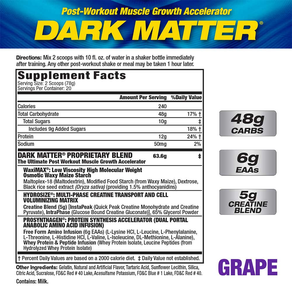 Sporttáplálkozási szakértők és testépítők körében köztudott, hogy az izomnövekedés stimulálásának legkedvezőbb időpontja, közvetlenül az edzés után van. Minél gyorsabban tudod a kritikus tápanyagokat a véráramba juttatni, annál hatékonyabban leszel képes beindítani és kiszolgálni az izomépítés gépezetét! Az MHP DARK MATTER olyan új technológiákat és összetevőket alkalmaz, amelyek lehetővé teszik a lehető leggyorsabb tápanyagfelvételt és olyan szinergikus anabolikus reakciót indítanak be, melynek során az inzulinszint egyszerre éri el csúcspontját az aminosav-, kreatin- és a glikogén transzporttal, az eredmény: extrém izomnövekedést és felgyorsult regeneráció!