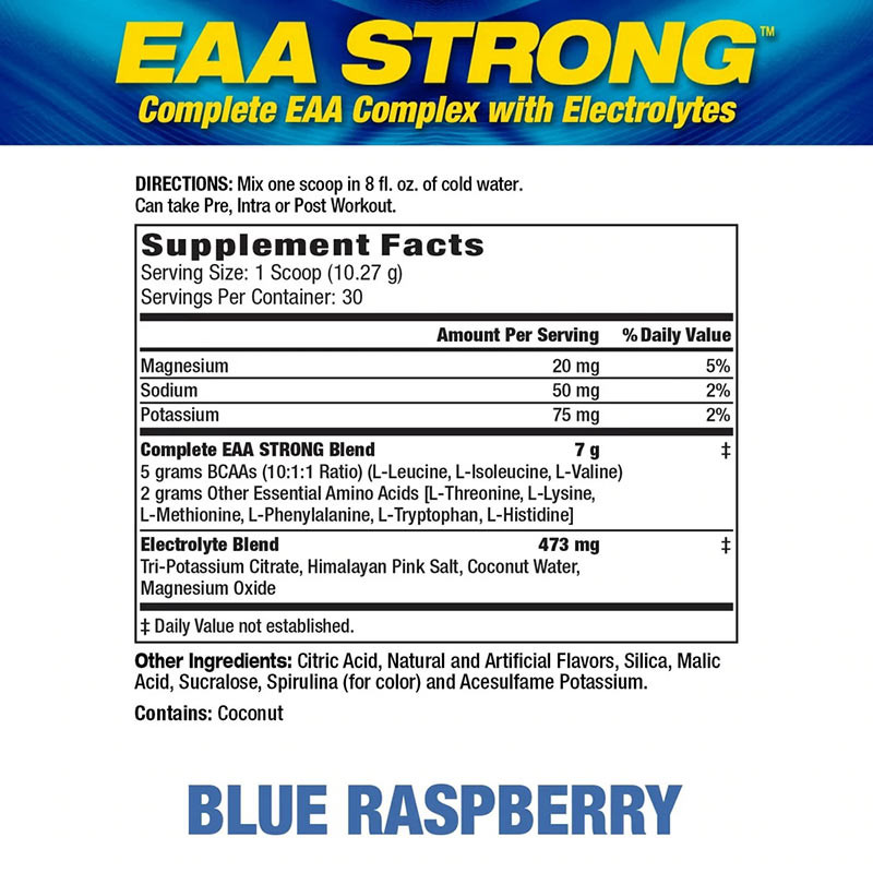 Az EAA STRONG 7 grammot tartalmaz mind a 9 esszenciális aminosavból, köztük 5 gramm elágazó láncú aminosavat. (BCAA-k) Ezek az esszenciális aminosavak támogatják az izomépítést és a felépülést, valamint megóvják az edzés közbeni izomleépülést.*