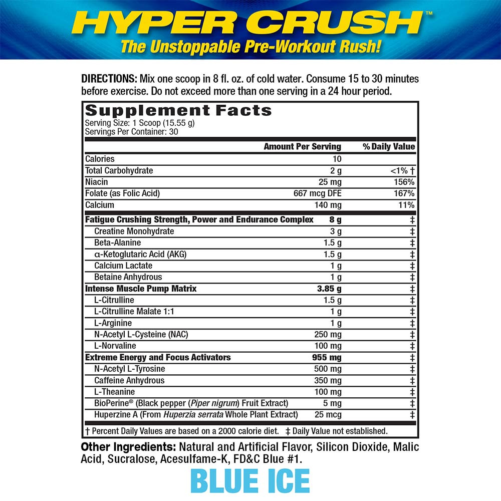 A HYPER CRUSH energiával, éles fókusszal és óriási erőlökettel ruház fel, amit jelentős izomnövekedés követ.* Érezni fogod, ahogy az izmaid duzzadnak, és minden egyes gyakorlatnál és ismétlésnél érezni fogod ahogy feszül a bőröd az izmaidon, mivel a fáradtság ellen küzdő technológiája lehetővé teszi, hogy keményebben edzhess mint bármikor korábban.*
