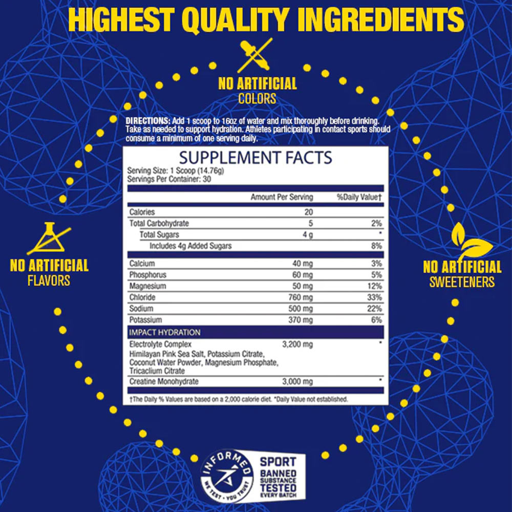 Az MHP IMPACT HYDRATION tudományos alapokon nyugvó, pontosan kiegyensúlyozott, hatékonyan adagolt elektrolitokat és kreatin-monohidrátot tartalmaz a szervezet jobb és gyorsabb hidratálása érdekében. Ennek a frissítő hidratáló pornak minden adagja 5x több elektrolitot tartalmaz, mint a vezető sporthidratáló italok, 3200 mg elektrolitot és egyéb fontos nyomelemeket 3000 mg kreatin-monohidráttal. Az IMPACT HYDRATION edzés közben is használható, hogy hidratált maradj, és hogy a legjobb teljesítményt nyújthasd. Edzés után is használható, hogy rehidratáld a szervezeted.