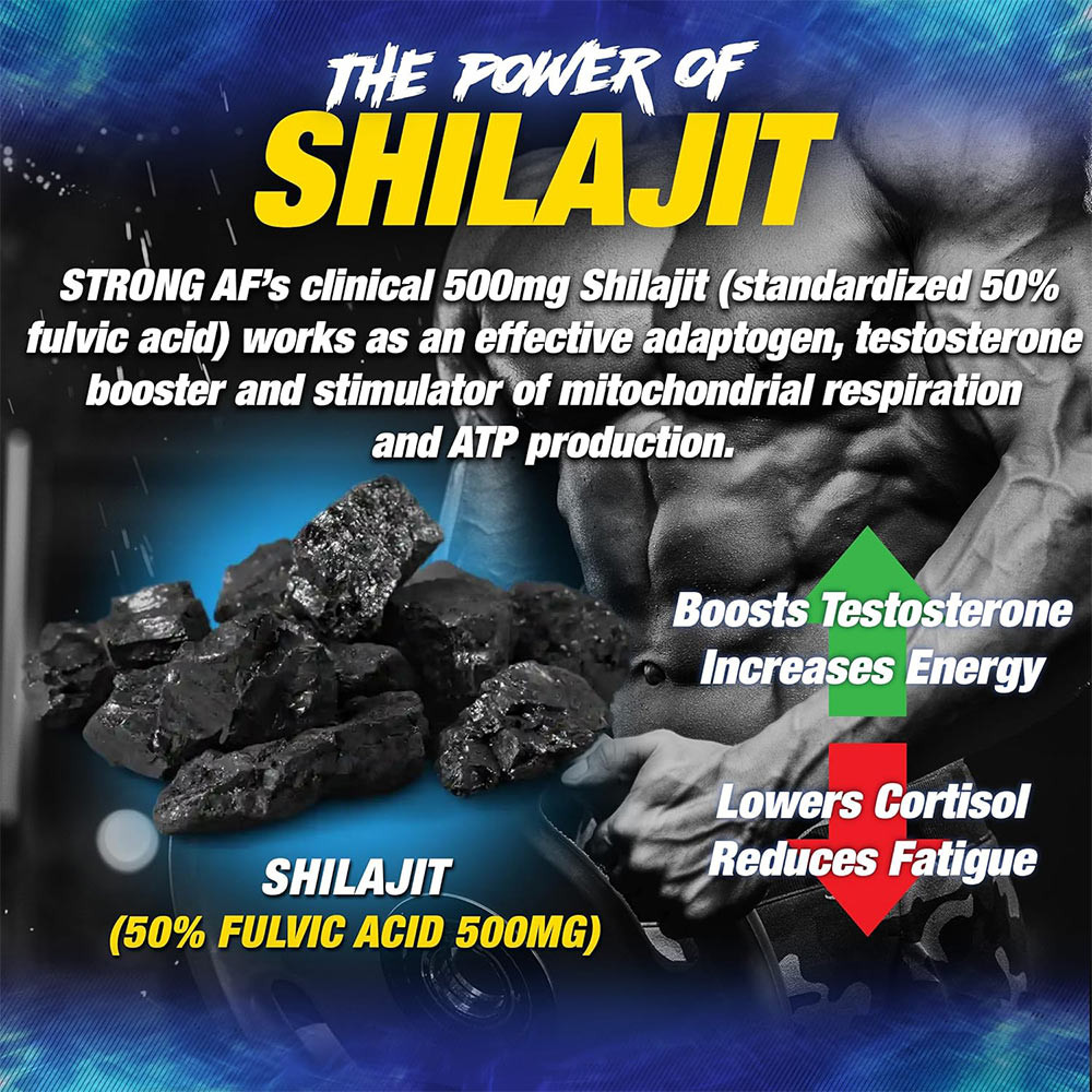 IZOMÉPÍTŐ HORMONOK OPTIMALIZÁLÁSA: A STRONG AF shilajit és Alpha-GPC kombinációja segít fokozni az izomépítés kulcsfontosságú szabályozóit a tesztoszteronszint növelésével és a kortizolszint csökkentésével.