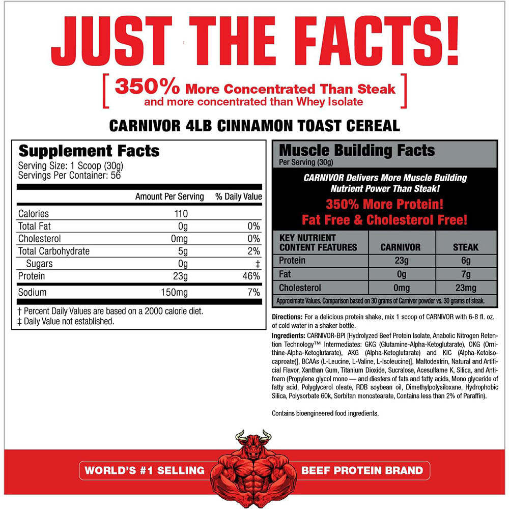 A marhahús a testépítők és erőatléták egyik legnépszerűbb és legkedveltebb tápláléka. A marhahús izomépítő és teljesítményfokozó erejét sportolók nemzedékei használták ki, majd kutatások tömege igazolta azt! A marhahús azonban sajnos a magas minőségű fehérje és anabolikus faktorok mellett, jelentős mennyiségű zsiradékot és koleszterint is tartalmaz. A CARNIVOR kifejlesztésével erre kínáltunk egy újabb és fejlettebb alternatívát, és ezzel átírtuk a fehérje-kiegészítés történelmét! Egy forradalmian új tisztítási, hidrolizációs és izolációs technológia segítségével a CARNIVOR a marhahús nyers erejét adja, méghozzá 350%-kal koncentráltabb és anabolikusabb formában, mint egy bélszínsteak!