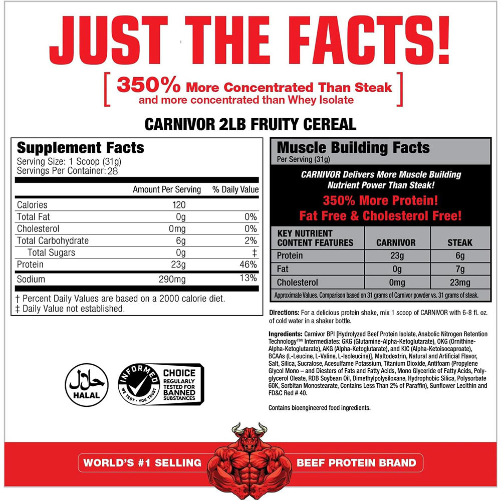 A marhahús a testépítők és erőatléták egyik legnépszerűbb és legkedveltebb tápláléka. A marhahús izomépítő és teljesítményfokozó erejét sportolók nemzedékei használták ki, majd kutatások tömege igazolta azt! A marhahús azonban sajnos a magas minőségű fehérje és anabolikus faktorok mellett, jelentős mennyiségű zsiradékot és koleszterint is tartalmaz. A CARNIVOR kifejlesztésével erre kínáltunk egy újabb és fejlettebb alternatívát, és ezzel átírtuk a fehérje-kiegészítés történelmét! Egy forradalmian új tisztítási, hidrolizációs és izolációs technológia segítségével a CARNIVOR a marhahús nyers erejét adja, méghozzá 350%-kal koncentráltabb és anabolikusabb formában, mint egy bélszínsteak!
