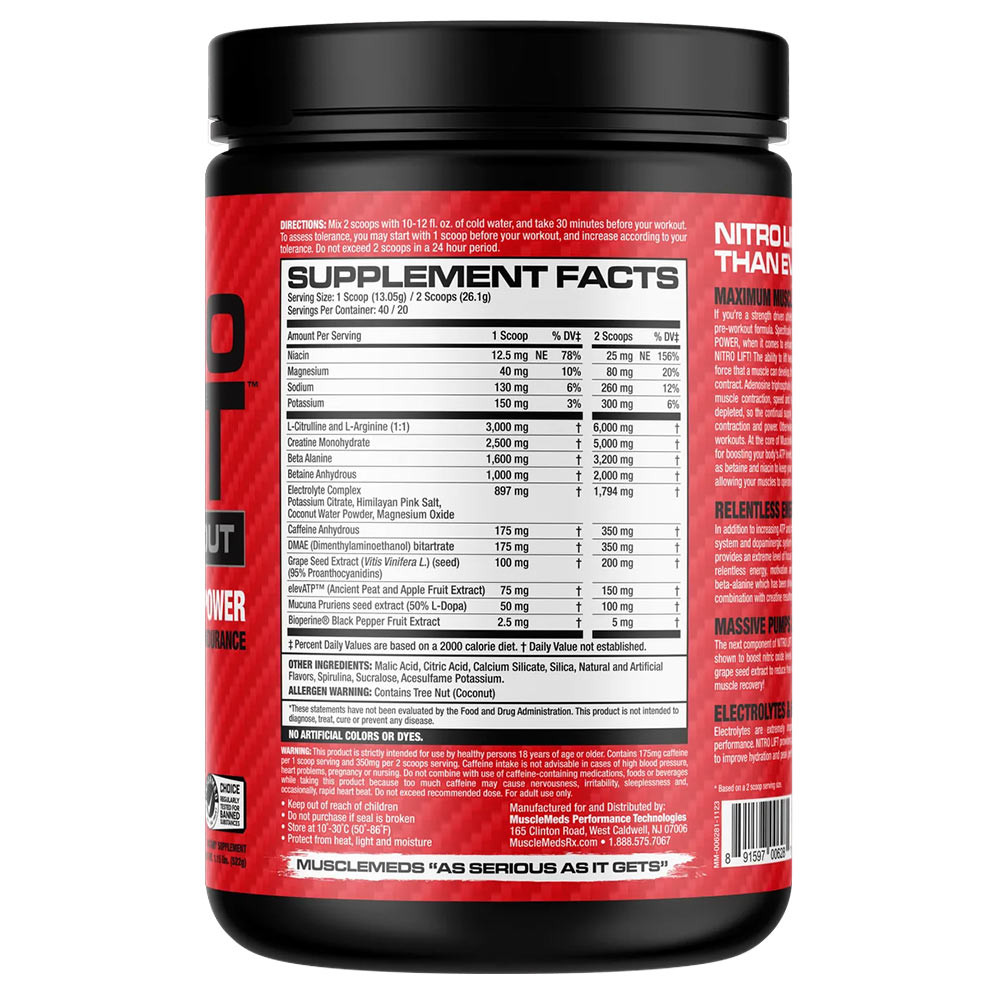 A NITRO LIFT-et széles körben kutatott összetevőkkel állítottuk össze, hogy fokozza az izomépítést, az izomerő és az általános edzés teljesítményt. A NITRO LIFT egy hatásos formula, ezért szándékosan úgy adagoltuk, hogy a felhasználók testméretük, személyes céljaik és egyéni tolerálhatóságuk alapján választhassák az 1 kiskanálnyi vagy a 2 kiskanálnyi adagot. A NITRO LIFT az edzés előtti megoldás a komoly sportolók számára, akik csak a legjobbat követelik.