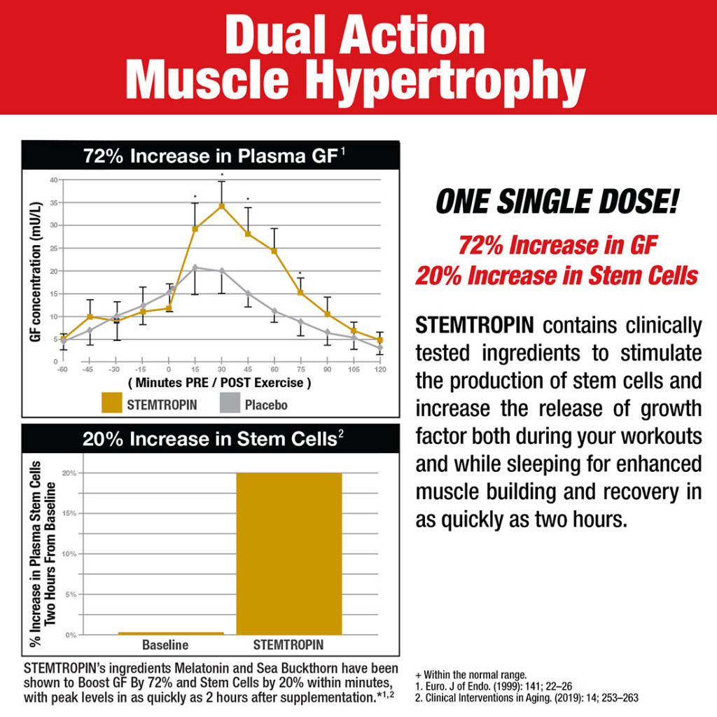 A STEMTROPIN klinikailag tesztelt összetevőket tartalmaz, amelyekről bebizonyosodott, hogy jelentősen és gyorsan növelik az őssejtek termelését és a növekedési hormon felszabadulását mind edzés közben, mind alvás közben.