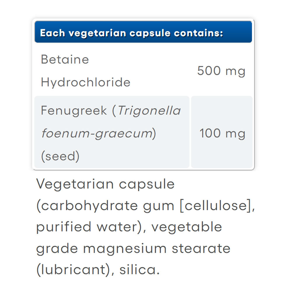 A gyomorsavtermelés az életkor előrehaladtával csökken, ami csökkenti az emésztés és a tápanyagok felszívódásának hatékonyságát. A Natural Factors Betain Hydrochloride with Fenugreek támogatja a normális emésztést, és a gyomorsavszint növekedésének elősegítésével hatékony emésztést segítő szerként működik.