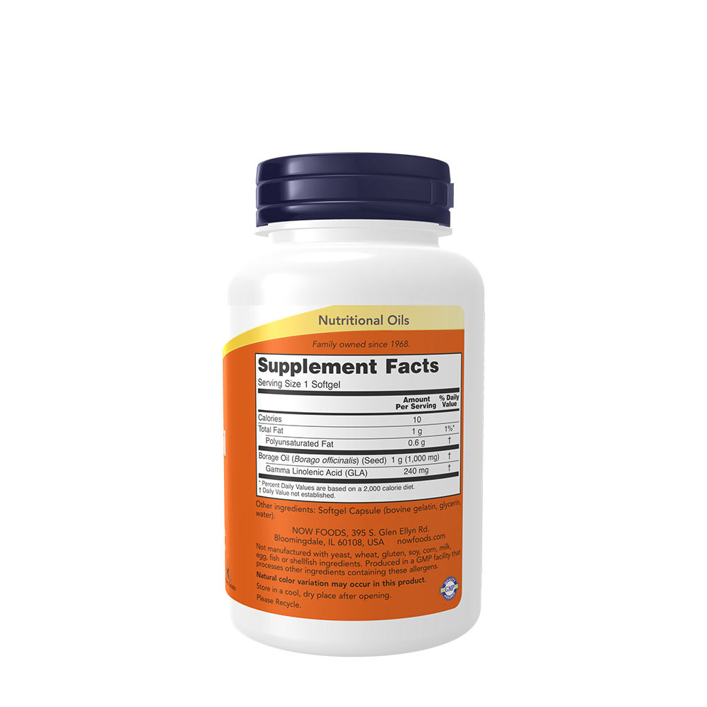 A NOW© Borage Oil egy tápláló olajat biztosít, amely 60%-ban többszörösen telítetlen zsírokat és körülbelül kétszer annyi gamma-linolénsavat (GLA) tartalmaz, mint a ligetszépe olaj.