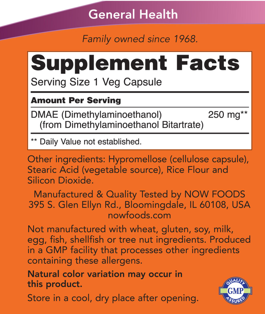 A NOW® DMAE (Dimethylaminoethanol) egy természetes aminoalkohol, amely az agyban kis mennyiségben található meg. Általában az elengedhetetlen tápanyag, a kolin prekurzorának tekintik, amely ahhoz szükséges, hogy az agy az acetilkolint előállítsa, ami egy idegátvivő anyag, amely részt vesz az idegjel továbbításában és az egészséges agyműködésben. * Nem tartalmaz búzát, glutént, szóját, tejet, tojást, halat, kagylót vagy dióféléket.