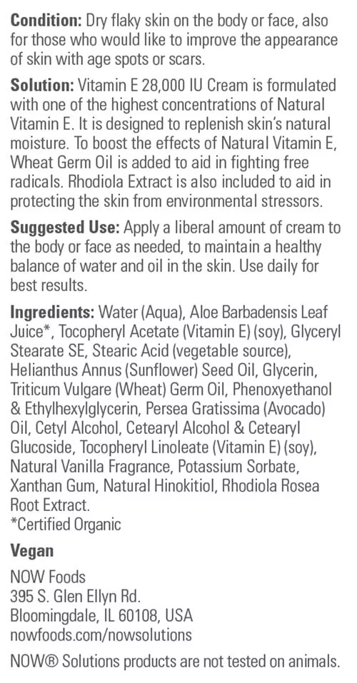 Megoldás: A NOW® Vitamin E 28,000 IU Cream a természetes E-vitamin legmagasabb koncentrációjával készült. A bőr természetes nedvességtartalmának pótlására szolgál. A természetes E-vitamin hatásának fokozása érdekében búzacsíra-olajat adnak hozzá a szabad gyökök elleni küzdelemhez. A Rhodiola kivonat szintén támogatja a bőrt a káros környezeti hatásokkal szemben. A NOW® Solutions termékeit a legmagasabb minőségi elvárások szerint készítik.