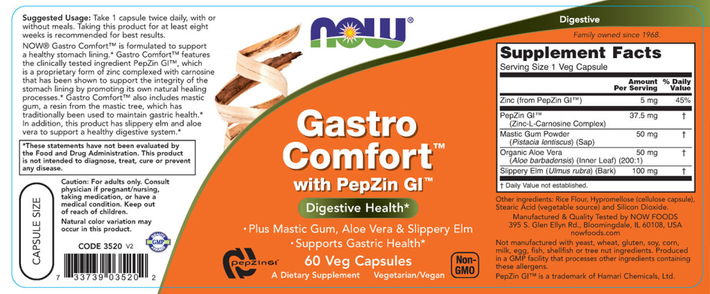 A Gastro Comfort™ a klinikailag tesztelt PepZin GI™ összetevőt tartalmazza, amely a karnozinnal komplexált cink szabadalmaztatott formája, amelyről kimutatták, hogy támogatja a gyomor nyálkahártyájának integritását azáltal, hogy elősegíti saját természetes gyógyulási folyamatait.* A Gastro Comfort™ masztix gumit is tartalmaz, a vad pisztáciából származó gyantát, amelyet hagyományosan a gyomor egészségének megőrzésére használnak.* Ezen kívül a termék vörös szilt és aloe verát is tartalmaz az egészséges emésztőrendszer támogatása érdekében.*