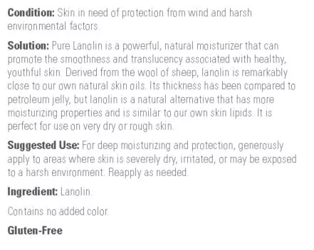 Megoldás: A Pure Lanolin egy erős, természetes hidratáló, amely elősegíti az egészséges, fiatalos bőr simaságát és hidratáltságát. A juhgyapjúból származó lanolin, figyelemre méltóan hasonló adottságokkal bír, mint a saját természetes bőrolajunk. Tulajdonságai emlékeztetnek a vazelinre, ám a lanolin egy természetes alternatíva, amelynek több hidratáló tulajdonsága van, és hasonló a saját bőrünk lipideinkhez. Kiválóan alkalmas nagyon száraz, vagy durva bőrre.