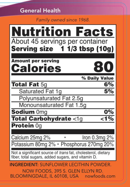 A Sunflover Lecithin Powder foszfatidil-kolint tartalmaz, amely a sejtmembránban a leggyakoribb foszfolipid. Természetesen tartalmaz phosphatidyl inositolt, phosphatidyl ethanolamine-t és esszenciális zsírsavakat is. A lecitin nemcsak lebontja a zsírsejteket, hanem hozzájárul az optimális zsíranyagcseréhez, megakadályozza, hogy a zsírsejtek lerakódjanak az érfalon, így csökkenti a koleszterinszintet, továbbá tisztítja az érfalakat és erősíti a szívizomzatot. A NOW® napraforgó lecitin por szója- és GMO-mentes.
