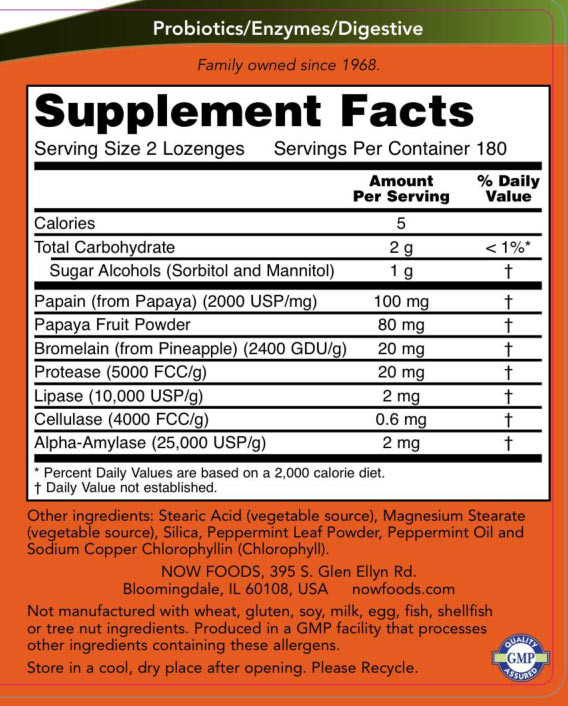 Az emésztőenzimek nélkülözhetetlenek a táplálék lebontásához és felszívódásához. A szervezet emésztőenzim termelési képessége a kor előrehaladtával csökken, ezért az emésztés hatékonysága romlik.* A NOW® Papaya Enzyme rágótablettái segítik az emésztést és friss leheletet biztosítanak az étkezések után.* A rágótabletták teljes, kezeletlen, porlasztva szárított papaya port tartalmaznak. A tablettánként 40 mg papaya mellett proteáz, lipáz és celluláz került hozzáadásra a teljes spektrumú enzimaktivitás érdekében.