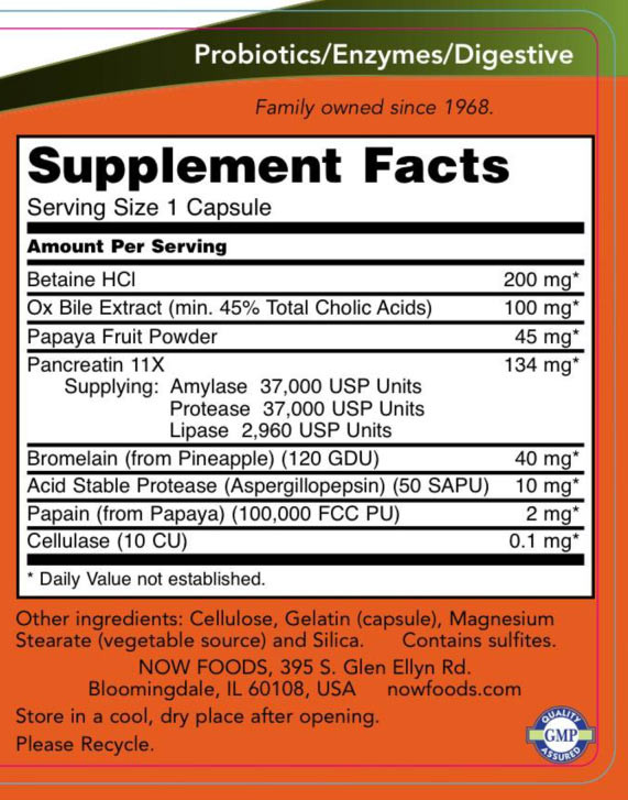 A NOW® Super Enzymes az emésztési problémák és zavarok támogatására kifejlesztett termék. Ez a szuperenzimes kiegészítő egy széles spektrumú emésztőenzim keveréket tartalmaz, mely segíti az elfogyasztott tápanyagok emésztését és az ezzel járó emésztési problémák, mint a puffadás, teltségérzet, vagy az étvágytalanság csökkentését. A Super Enzymes bromelaint, ökörepét, pankreatint és papaint tartalmaz így támogatja mind a zsírok, a szénhidrátok és a fehérjék emésztését.