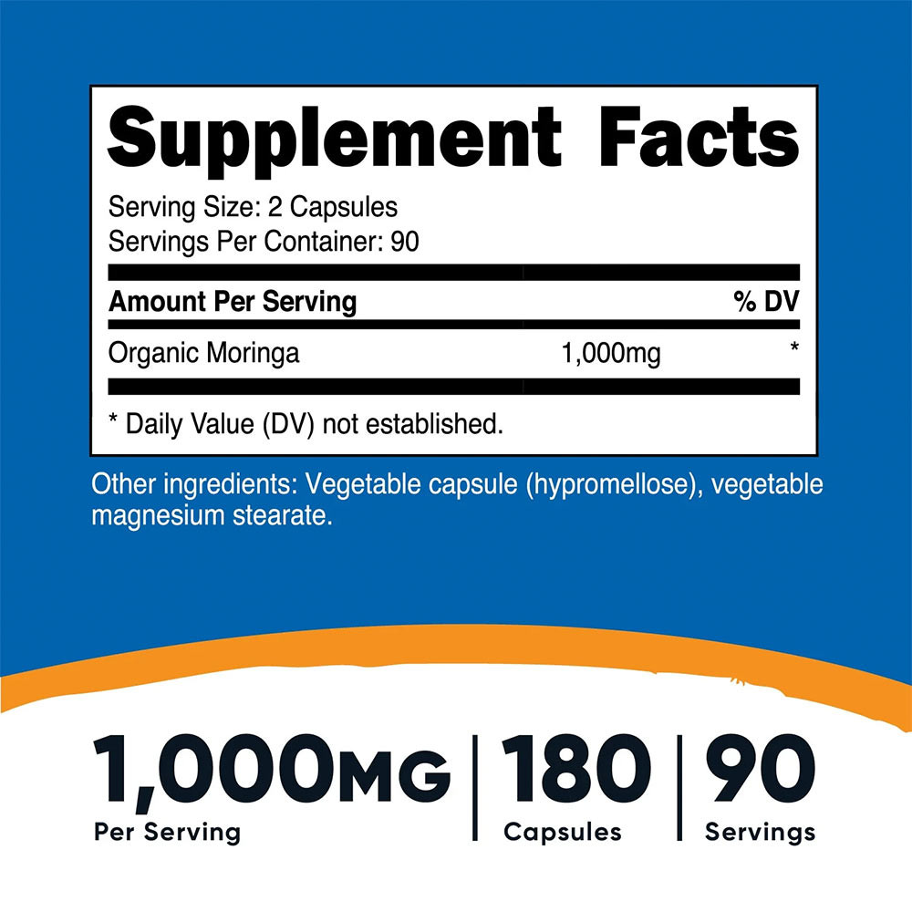 A Nutricost Moringa kapszula 90 adagot tartalmaz, minden kapszulában 1000 mg Moringa van.