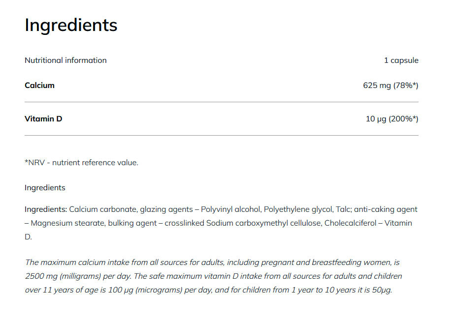 Ne lépd túl az ajánlott napi adagot. Az étrend-kiegészítő nem helyettesítheti a változatos étrendet. Kiegyensúlyozott étrend és egészséges életmód javasolt. A készítmény bármely összetevőjével szembeni túlérzékenység. Nephrolithiasis, veseelégtelenség és hyperparathyreosis esetén fordulj orvoshoz a készítmény alkalmazásáról. Más, magas kalcium- és D-vitamin tartalmú készítményt ne használj egyidejűleg. Kisgyermekeknél a fulladásveszély miatt ne alkalmazd.