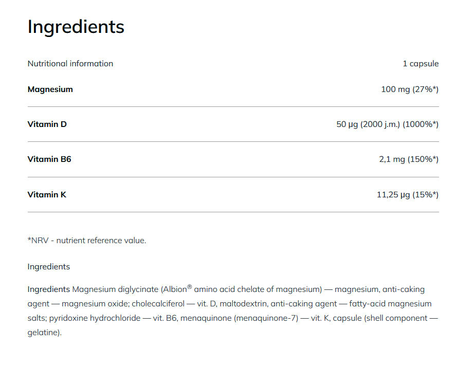 Étrend-kiegészítőként a szervezet magnézium-, D-, B6- és K-vitamin-szükségletének fedezésére.