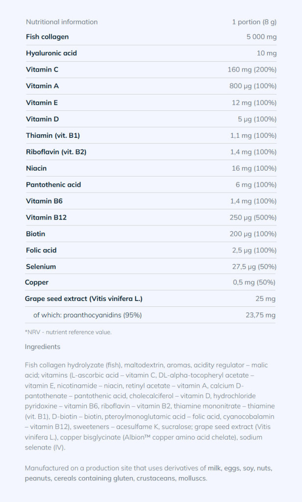 Az Olimp Collagen® egy por alakú étrend-kiegészítő, amely hidrolizált halból származó kollagént, hialuronsavat és vitaminokat tartalmaz, amelyeket gondosan kiválasztottak egyedi tulajdonságaik miatt. A termék tökéletesen megfelel azon nők igényeinek, akik ragyogó és egészséges megjelenésű bőrről, szép hajról és erős körmökről álmodnak.