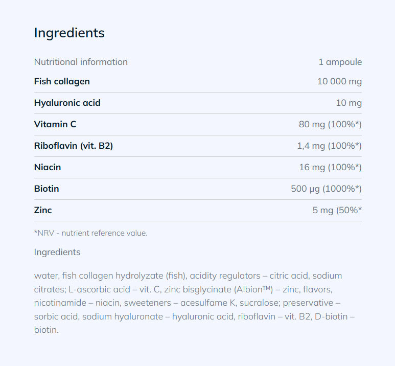 • Kollagén - 10 000 mg alacsony molekulatömegű (1000-2000 Da) halkollagén-hidrolizátum,