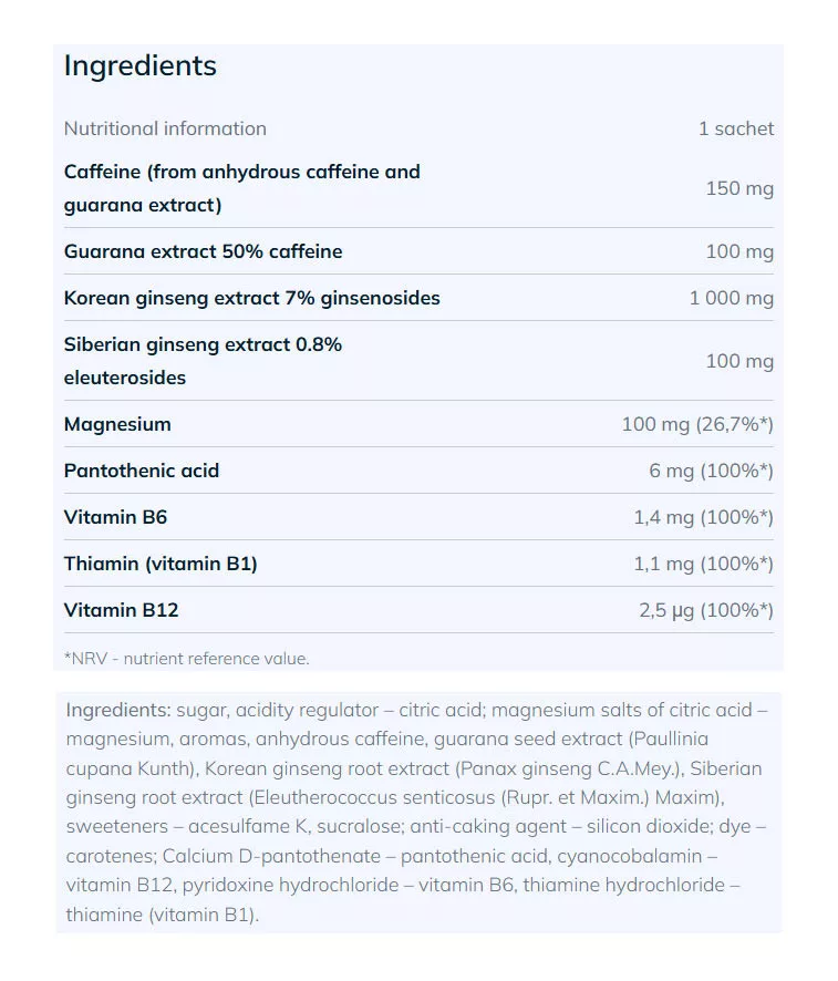 Magas koffeintartalmú termék (150 mg / 1 tasak), kétféle ginzeng standardizált kivonata: szibériai és koreai ginzeng, magnézium és B-vitaminok (pantoténsav, B6-vitamin, tiamin, B12-vitamin).