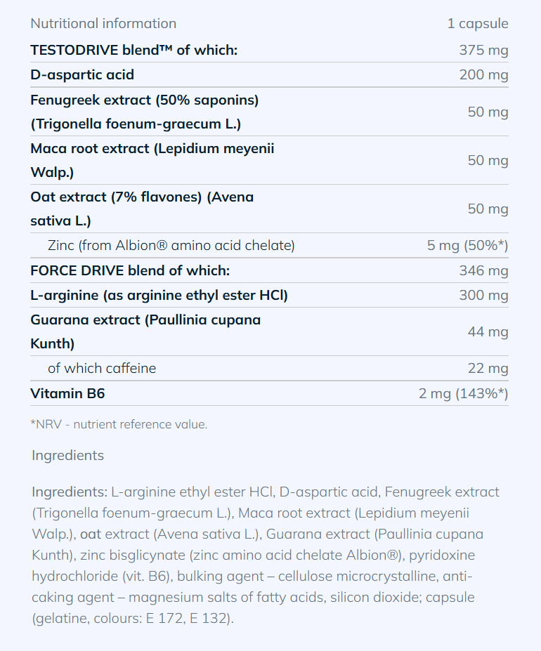 A D-aszparaginsavból, görögszéna kivonatból (50% szaponinok), Maca gyökér kivonatból, zabkivonatból és cinkből álló TESTODRIVE keverék hozzájárul a vér normál tesztoszteronszintjének fenntartásához és a megfelelő termékenységhez.
