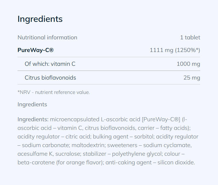 Új generációs PureWay-C® C-vitamin nagy dózisú, új generációs C-vitamint tartalmazó étrend-kiegészítő pezsgőtabletta formájában.