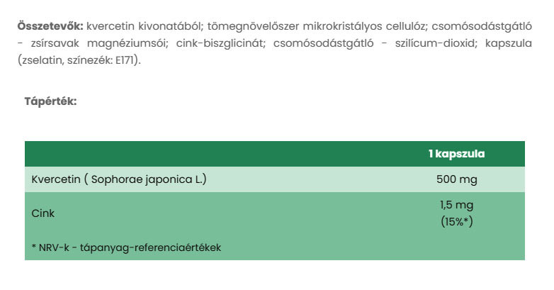 Az Olimp Labs Quercetin Premium cink tartalma is hozzájárulhat az immunrendszer megfelelő működéséhez. A cink egy nyomelem és antioxidáns. A cink elsősorban a hormonjaink termelődéséhez lehet a legfontosabb, de segíthet „beforrasztani” sebeinket, és leküzdeni a bakteriális és vírusos megbetegedéseket! Elengedhetetlen immunrendszer megfelelő a működéséhez, megvédje a sejteket az oxidatív károsodástól, fenntartásának a megfelelő csontok egészségét és hozzájárulhat normál bőr, a haj és a körmökegészségéhez.