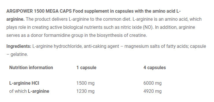 Az ARGI POWER™ 1500 MEGA CAPS® MEGA CAPSULES® 1500 mg legjobb minőségű gyógyszerészeti L-arginin HCL-t tartalmaz 1 kapszulában!