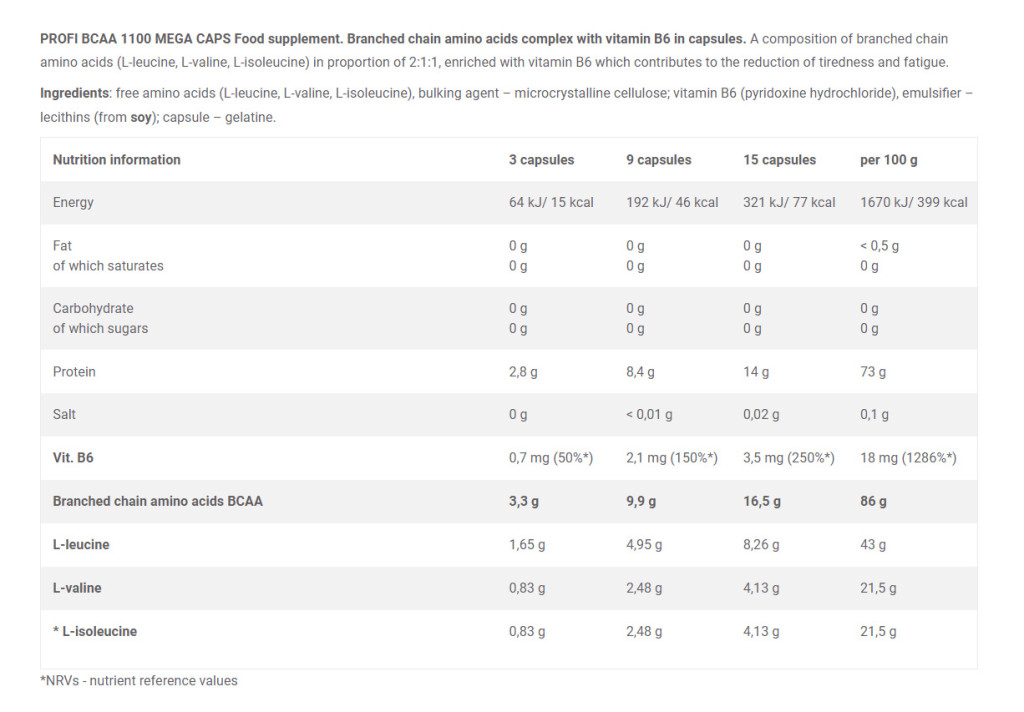Az Olimp BCAA 1100 Mega Caps összetétele
