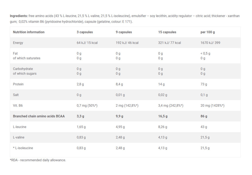 Érdemes tehát az Olimp BCAA 1100 Mega Caps étrend-kiegészítőhöz nyúlni, amely egyszerű és gyors módon segít kiegészíteni a napi étrendedet fehérjével és az említett BCAA aminosavakkal! A gyártó által ajánlott napi adagok mindegyike - 9 kapszula (3 kapszula, naponta háromszor) segít, hogy a szervezetedbe 8,4 g fehérjét és akár 9,9 g kristályos BCAA aminosavat juttass be pluszban, a leucin kettős dominanciájával a valin és az izoleucin felett.