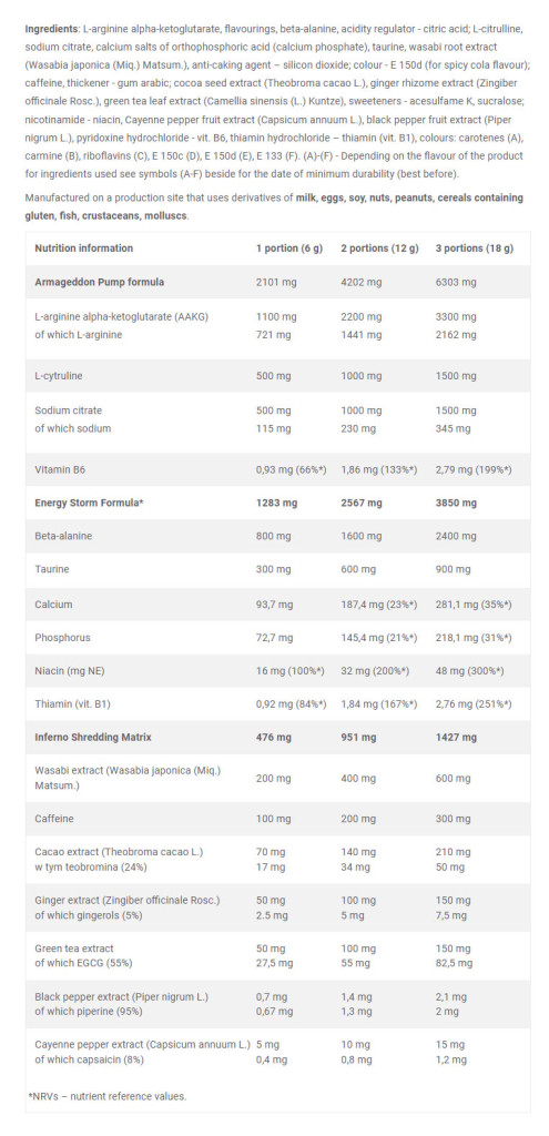 ARMAGEDDON-PUMP FORMULA - nagy dózisú citrullin és arginin erőteljes kombinációja, amelyek részt vesznek a nitrogén-oxid (NO) szintézisében a szervezetben. Az NO fokozott termelése az izomszövetek fokozott vérellátását eredményezi, ami a tápanyagok hatékonyabb szállításához vezet az izmokhoz. Emellett a nátriumionok használata optimalizálja a sejtek közötti terek rehidratálását, a citrátionok pedig fokozzák az izomsejtek létfontosságú pH-értékének fenntartását, aminek köszönhetően véd a savasodás ellen. Ez az összetétel olyan megismételhetetlen izompumpát biztosít, amelyet még soha nem tapasztaltál.
