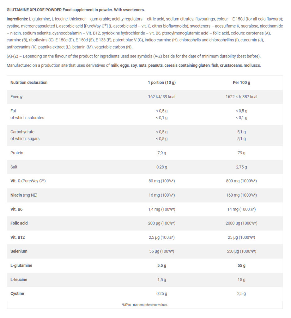 Az Olimp Glutamine Xplode páratlan anabolizmusát még tovább fokozza a hozzáadott rendkívül tiszta Leucin aminosav, mely az izomépítés másik kiemelkedően fontos kulcsszereplője! Egyes kutatások alapján a szteroidok természetes alternatívájaként is szóba jött, mivel annyira jó hatással van az izomfejlődésre! Az izomzat egyharmadát alkotó BCAA aminosavak „vezére”, gyakorlatilag a 90%-a közvetlenül az izomsejtekben bomlik le közvetlen energiát pumpálva beléjük! Rendkívül hatékony ellenszere az edzéssel járó katabolizmusnak (izomvesztésnek), így megakadályozza a kemény edzéssel járó „egyet hátra, kettőt előre” effektust. Így a regeneráció már egyből egy előrehaladottabb pozícióból indulhat!