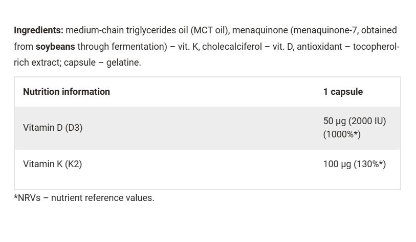 • A D3 és K2 vitaminok kombinációja támogatja az egészséges csontokat és fogakat.