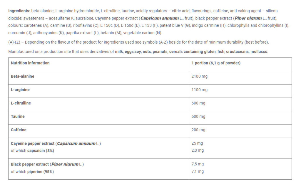 A termék nagy dózisban tartalmaz béta-alanint és L-arginint, valamint L-citrullint, taurint és koffeint.