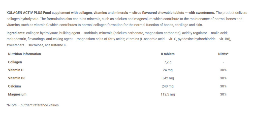 Kollagént, vitaminokat és ásványi anyagokat tartalmazó étrend-kiegészítő - citrus ízű rágótabletta - édesítőszerekkel.