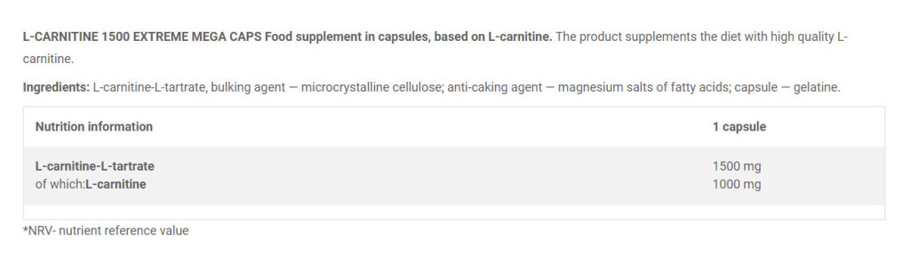 Az L-Carnitine 1500 Extreme Mega Caps étrend-kiegészítő, ezért nem tekinthető a kiegyensúlyozott táplálkozás helyettesítőjének, csak kiegészítésnek. Az egészséges életmód és a kiegyensúlyozott táplálkozás erősen ajánlott.