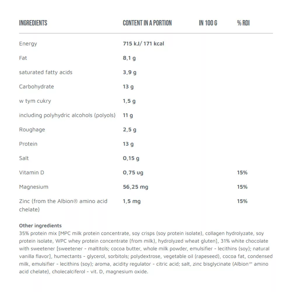 Az Olimp fehérjeszeletet D-vitaminnal, magnéziummal és cinkkel egészítették ki, magasan felszívódó Albion™ cink-aminosav kelát formájában.