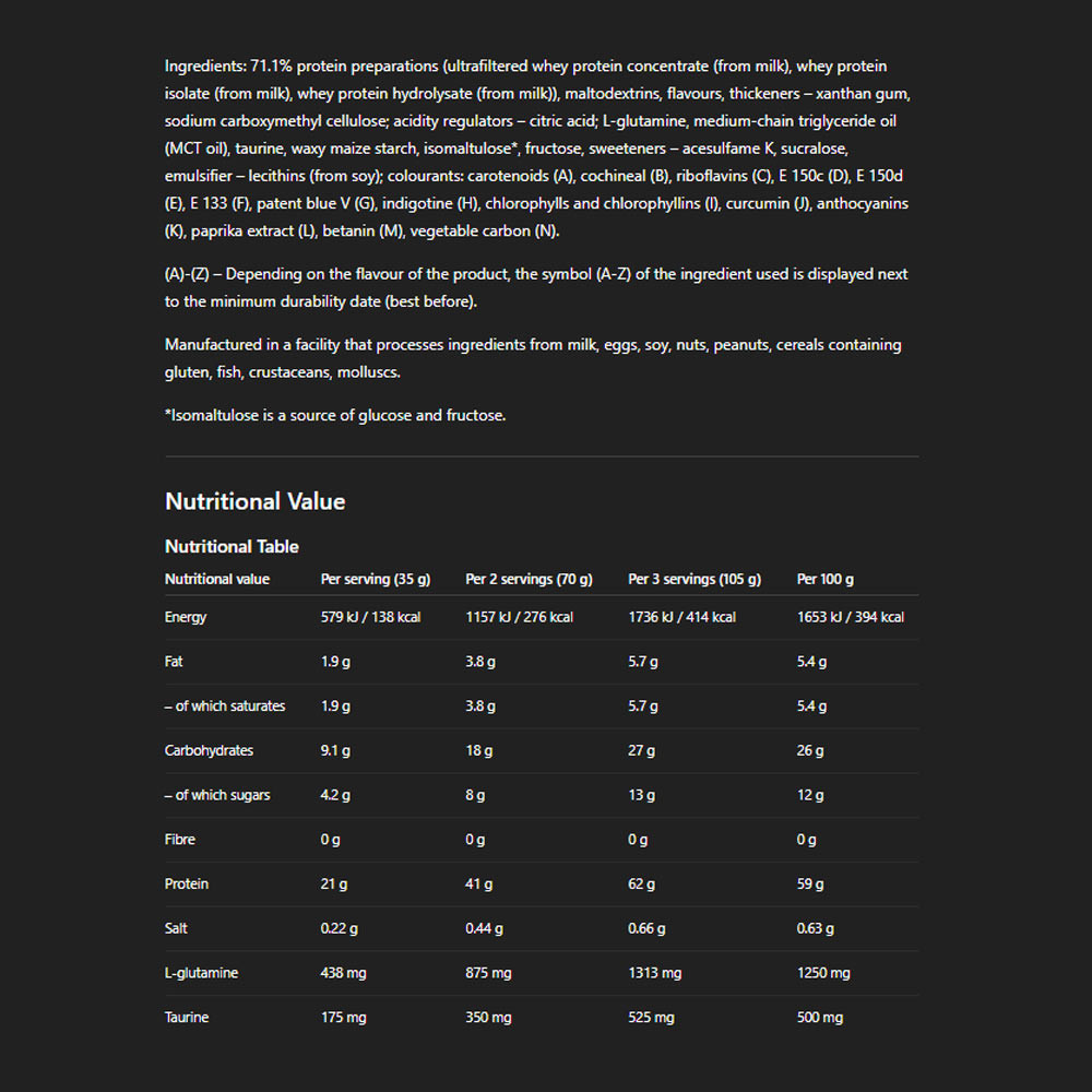Fogyassz naponta 1-3 adagot - reggeli előtt, étkezések között, edzés után vagy lefekvés előtt. Adj 1 adagot (35 g = 1 adagolókanál) 200 ml vízhez. Elkészítés után azonnal fogyaszd.