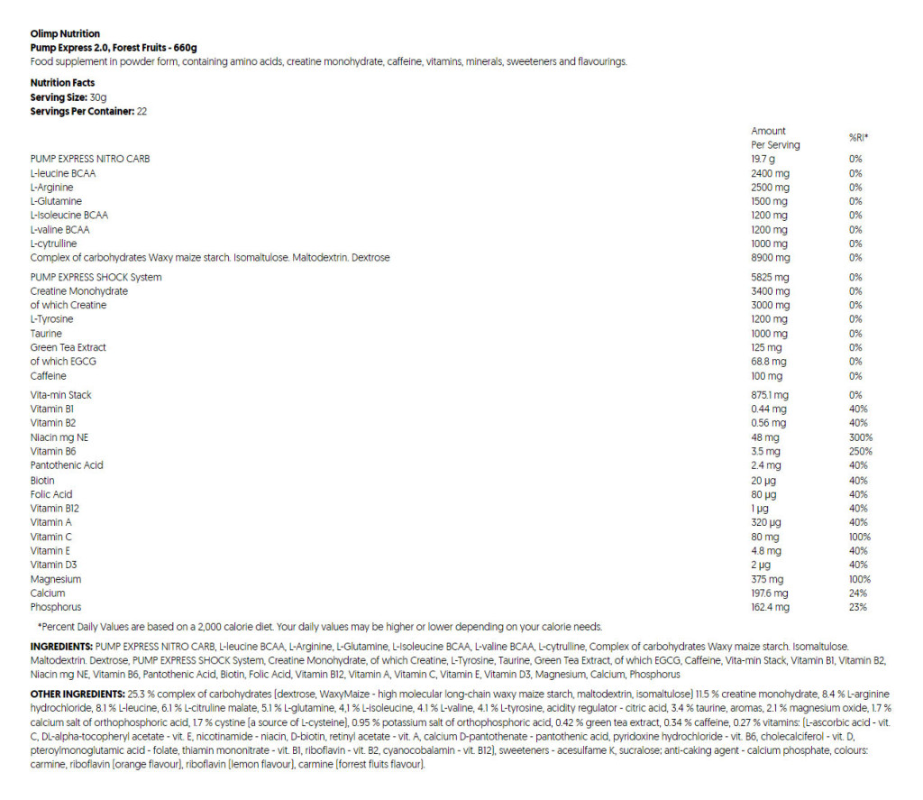 PUMP EXPRESS 2.0 KONCENTRÁTUM Élelmiszer-kiegészítő por formájában. Cukrot és édesítőszert tartalmaz. A három tökéletes formula egyedülálló összetételének köszönhetően rendkívül gyorsan megbirkózik a legigényesebb edzésekkel is: PUMP EXPRESS NITRO CARB - az erőfeszítéshez alapvető tiszta aminosavak és szénhidrátok kombinációja differenciált vércukorértékekkel, PUMP EXPRESS SHOCK System - az erőfeszítéshez jelentős mennyiségű mikronizált kreatin és gyógyszerészeti koffein, valamint Vita-MIN STACK- a hatékony erőfeszítéshez nélkülözhetetlen vitaminok és ásványi anyagok komplexe. A kreatin fogyasztása növeli a fizikai teljesítményt rövid távú, nagy intenzitású, ismétlődő edzésmenetek során (napi 3g kreatin bevitelére vonatkozik).