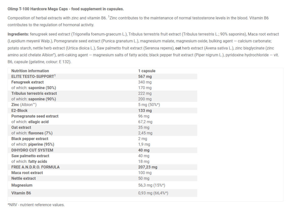 Kíváncsi vagy, hogyan lehet fenntartani a tesztoszteronszintet a vérben? Pontosan erre a célra az Olimp Laboratories gyógyszergyár szakemberei innovatív technológiát alkalmazva megalkották a T-100 Hardcore Mega Caps by Olimp Sport Nutrition-t. A készítmény kiváló minőségű összetevők, többek között növényi kivonatok és cink kombinációja, magnéziummal és B6-vitaminnal dúsítva.
